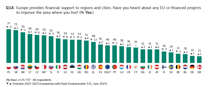 79% obywateli UE, którzy wiedzą o projektach finansowanych przez UE, uważa, że mają one pozytywny wpływ na ich region lub miasto. 57% stwierdziło, że projekty finansowane przez UE w ich okolicy przyczyniły się „w pewnym lub dużym stopniu” do ich poczucia bycia obywatelami UE. Odsetek respondentów świadomych projektów współfinansowanych przez UE utrzymuje się na stabilnym poziomie około 40% od 2019 roku. 64% uważa, że UE powinna inwestować we wszystkie swoje regiony, a nie tylko w te uboższe. Respondenci jako priorytet w zakresie inwestycji wskazali regiony o wysokim bezrobociu (63%).