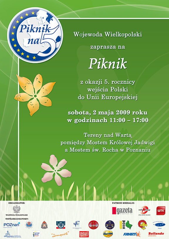 02 maja 2009 r Wojewoda Wielkopolski wspólnie m.in z Punktem Informacyjnym Europe Direct - Poznań organizuje "Piknik z okazji 5 rocznicy wejścia Polski do Unii Europejskiej".