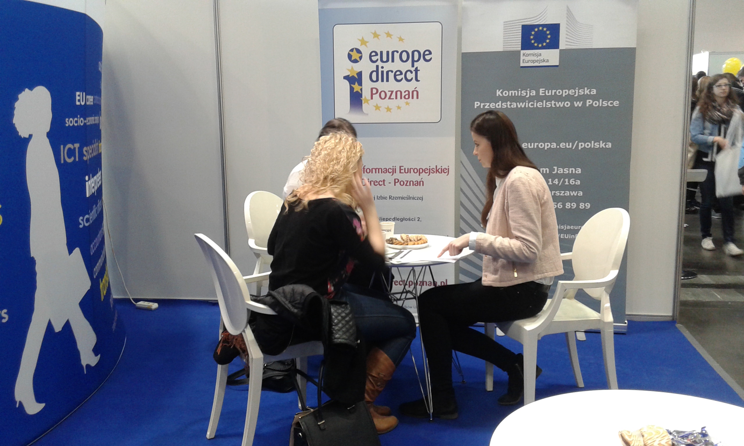 Studenci mieli okazję jednocześnie odwiedzić stoisko Przedstawicielstwa Komisji Europejskiej w Polsce i Punkt Informacji Europejskiej Europe Direct – Poznań. Wspólnie odpowiadaliśmy na pytania dotyczące pracy, staży w instytucjach unijnych.